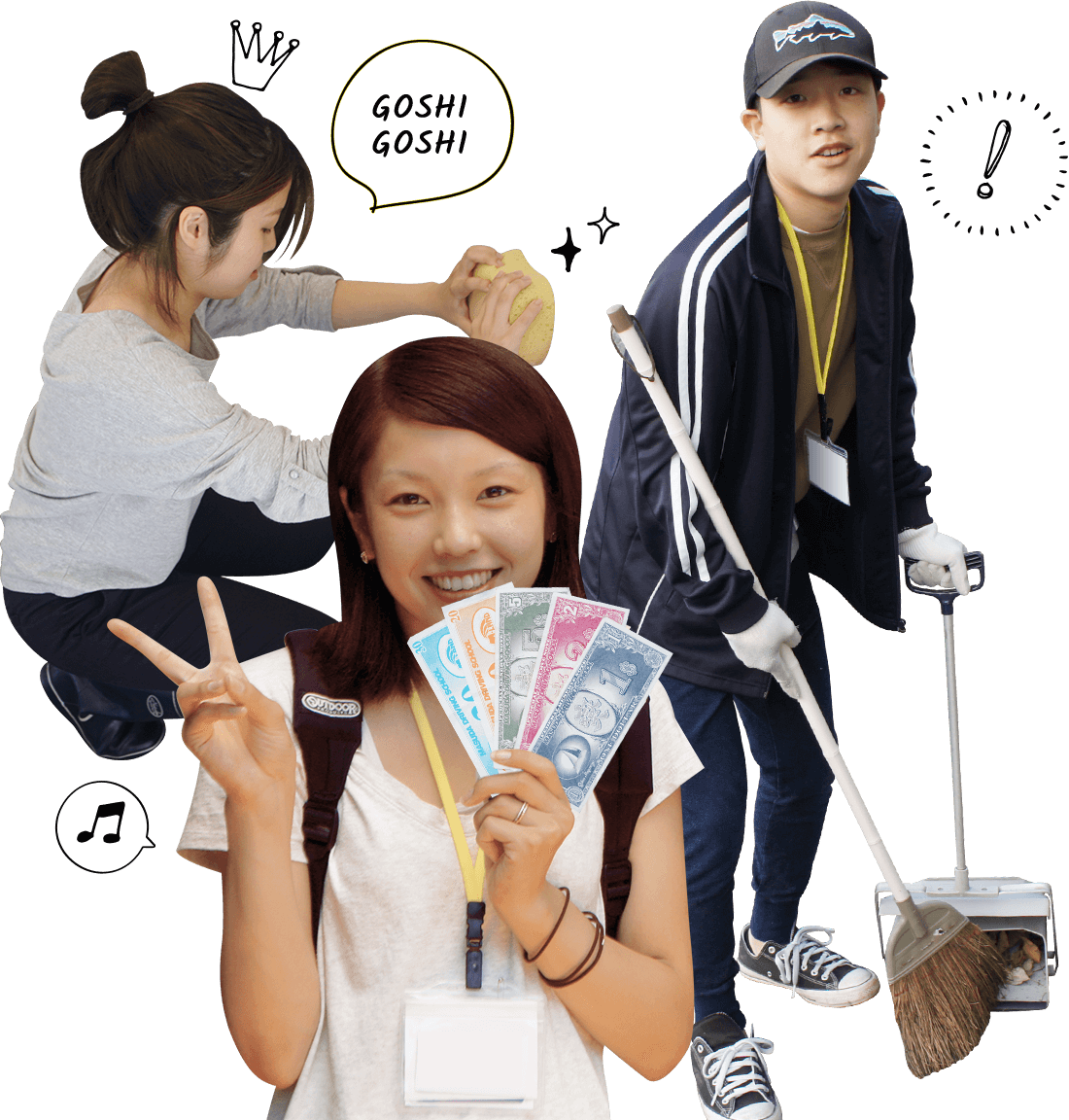 Mランドには、校内だけで使える独自通貨の「Mマネー」があります。Mランド名物として人気のトイレ掃除や校内清掃のほか、ありがとうカードやお茶席体験といったボランティアや文化活動をするとGETでき、カフェやコンビニなどで使うことができます。