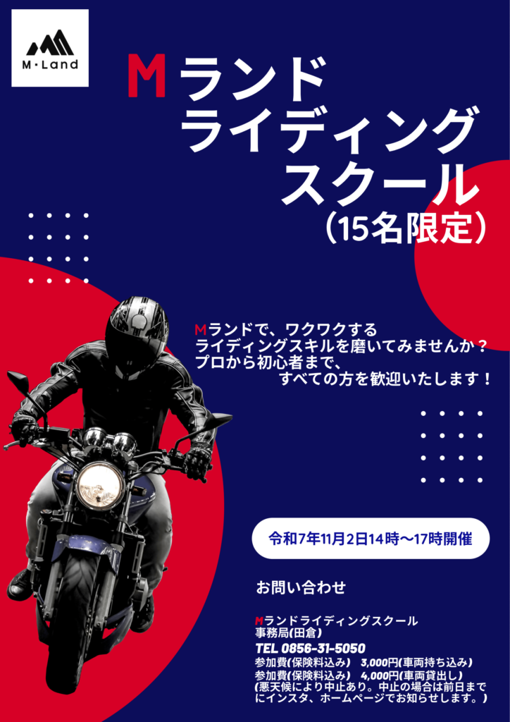 | 参加費 | 持ち込みバイク有の場合:3,000円(保険込) バイクレンタルの場合:4,000円(保険込) |
